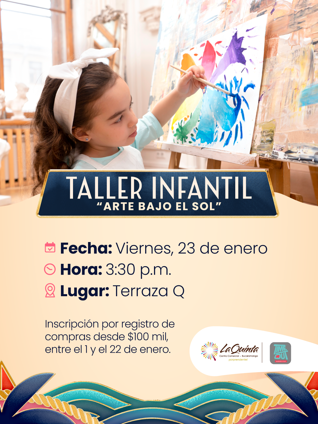 Por el registro de compras acumuladas iguales o superiores a $100 mil, realizadas entre el 1 y el 22 de enero, nuestros clientes podrán inscribir a sus hijos (entre 3 y 10 años) en el taller Arte bajo el Sol con Time Out.