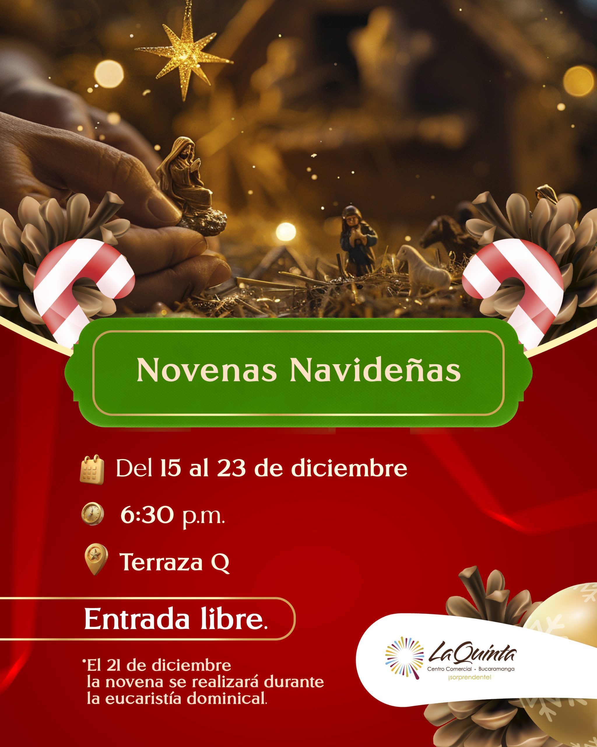 Del 15 al 23 de diciembre celebraremos las novenas navideñas en la Terraza Q a las 6:30 p.m. Entrada libre. *El domingo 21 de diciembre la novena se realizará en la eucaristía dominical de las 11:30 a.m