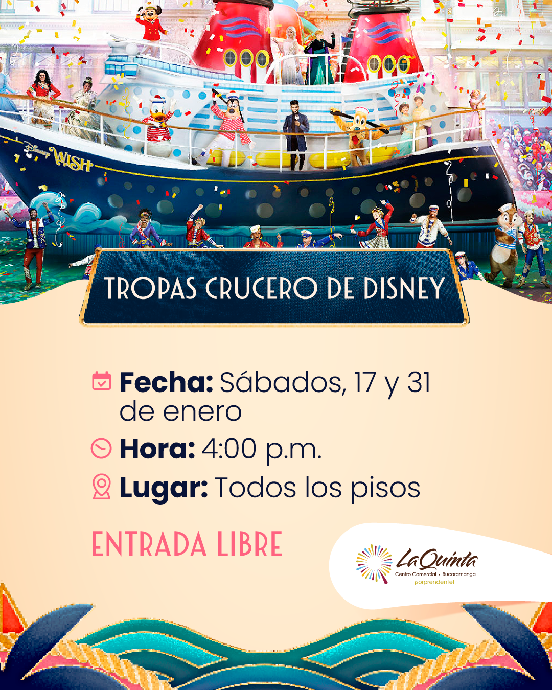Vive una experiencia unica con Mickey y sus amigos en crucero, durante las tardes del 17 y del 31 de enero. Hora: 4:00 p.m. Lugar: Todos los pisos del centro comercial